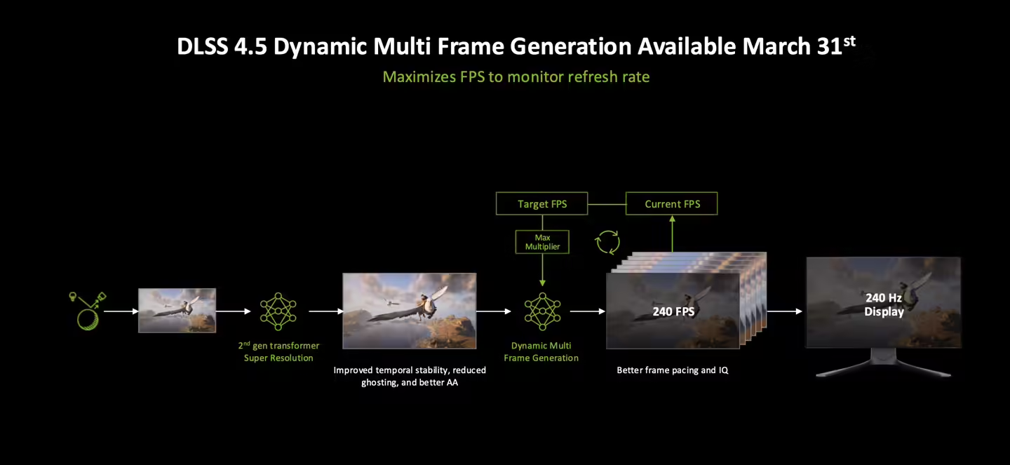 PChome3月11日消息,英伟达DLSS 4.5的六倍多帧生成技术将于3月31日通过NVIDIA App Beta版正式开放,专为RTX 50系显卡用户打造,通过动态帧生成倍率调整,可实现最高6倍帧率提升,破解高刷高画质性能瓶颈。
