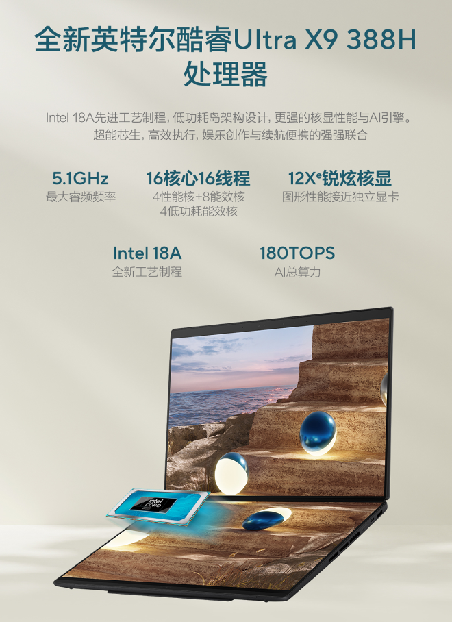 现代职场,效率至上,一台能稳定运行的电脑无疑是必备的生产力利器。华硕灵耀14双屏2026凭借高性能配置,轻松满足用户对笔记本电脑的高性能期待。它搭载英特尔酷睿Ultra X9 388H第三代处理器,采用16核心16线程设计,最大睿频可达5.1GHz,强劲性能足以轻松应对撰写文档、处理数据表格、制作PPT、剪辑视频等各类工作。同时,它内置英特尔锐炫 B390核显,采用全新Xe3架构,配备12个Xe核心,应用XeSS3图形技术,图形处理能力大幅提升,无论是图形渲染还是3D建模等图形密集型工作,都能流畅完成。此外,它还支持AV1、H.266编码,输出视频时,能够兼顾高清画质与文件体积优化,显著提高视频压缩效率。为进一步提升AI任务处理效率,它搭载低功耗AI引擎,协同CPU、GPU、NPU三大AI引擎,具备180TOPS的AI总算力,在进行AIGC内容创作、AI对话、本地模型训练时速度更快,大幅缩短等待时长,AI辅助内容输出更高效。