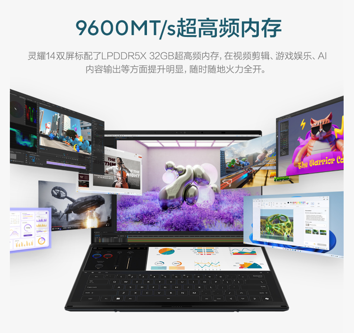 华硕灵耀14双屏2026还配备了32GB LPDDR5x 9600MT/s高频内存,无论是运行PS、PR等专业创作软件,还是大型游戏等高负载任务,都能保持流畅运行,即便同时开启微信、多个网页,也能实现丝滑切换。它最高可选配2TB PCIe 4.0高速固态硬盘,为存储数据、高清素材以及大型应用安装提供海量存储空间,无需为存储空间不足而烦恼。