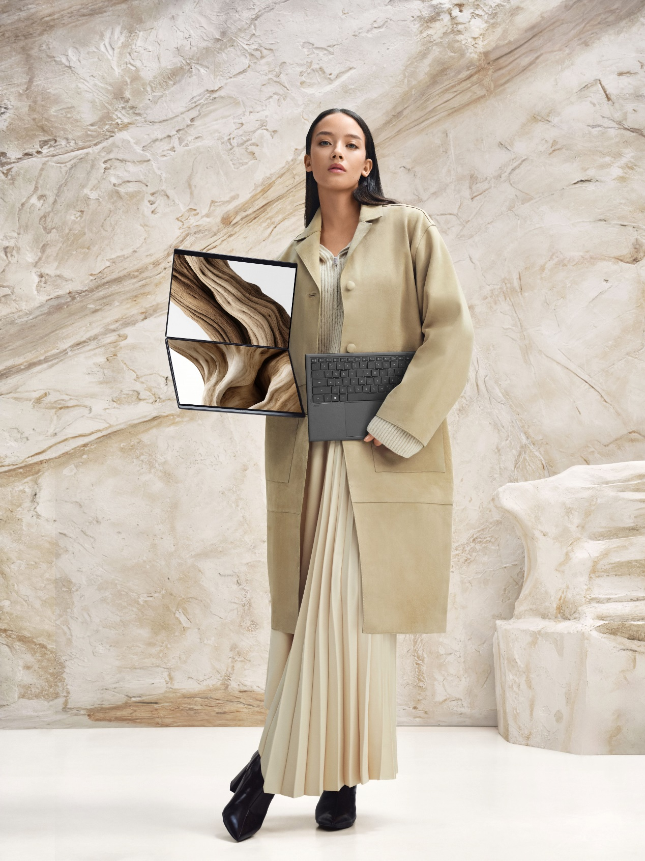 对于从事美工设计、视频剪辑等领域的专业人士来说,屏幕的显示效果至关重要,高分辨率、高色准、高亮度等配置缺一不可。华硕灵耀14双屏2026采用双14英寸2.8K 144Hz 1000nits OLED触控华硕好屏。两块屏幕均具备100% P3广色域覆盖、10bit色深、ΔE<1高色准以及100万:1超高对比度,色彩呈现自然精准,无偏色现象,完美适配照片精修、视频后期渲染等工作。为确保在户外使用场景中也能获得清晰显示效果,屏幕具备1000尼特的峰值亮度,搭配AR抗反射涂层,在强光环境下屏幕画面依然清晰。144Hz高刷新率协同0.2ms疾速响应,杜绝画面拖影,网页浏览、视频播放尽享丝滑观感。灵耀14双屏2026还提供了瀑布模式、竖屏模式、分享模式、虚拟键盘模式以及常规笔记本模式5种使用模式,用户可自由切换。美工设计或视频剪辑师可使用瀑布模式,在此模式下,两个屏幕可独立显示不同内容,在PS、Pr等专业应用中,将副屏用于展示工具栏、菜单栏,主屏专注于作品创作;竖屏模式则满足浏览文档、程序员编写代码的使用需求;当屏幕开合角度达到175°以上时,会开启全新的智能分享模式,屏幕弹出专属工具栏和投影选项,实现高效案例分享,拓展使用边界。