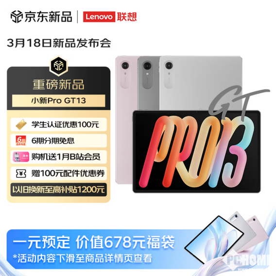 联想将于3月18日发布首款支持端侧一键部署OpenClaw的AI平板,其中小新Pro GT 13在京东独家首发,提供1元预约锁678元福袋、以旧换新至高补贴1200元等福利。
