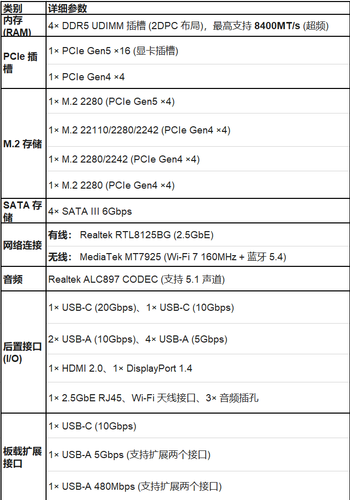 规格方面,采用250mm×244mm的非标准尺寸,比标准M-ATX长6mm,为背部供电接口预留空间。供电方面搭载14+1+1+1相60A DrMOS供电,支持英特尔酷睿Ultra 7 270K Plus处理器;提供GC-HPWR显卡直插供电口、4个M.2接口和2条PCIe插槽。