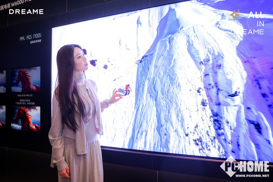 在画质方面,R8000系列还搭载独家黑晶臻彩屏技术,拥有1.28%超低反射率与AG25防眩光结构,并通过逐台色准校准算法实现ΔE<1专业级色准与DCI P3≥98%的色域表现。同时,Dreamind Master AI音画处理器融合10大AI算法,实现对画面清晰度、色彩与音效的实时优化,使R8000不仅在形态上突破传统电视固有印象,更在音画体验上实现了系统级提升。