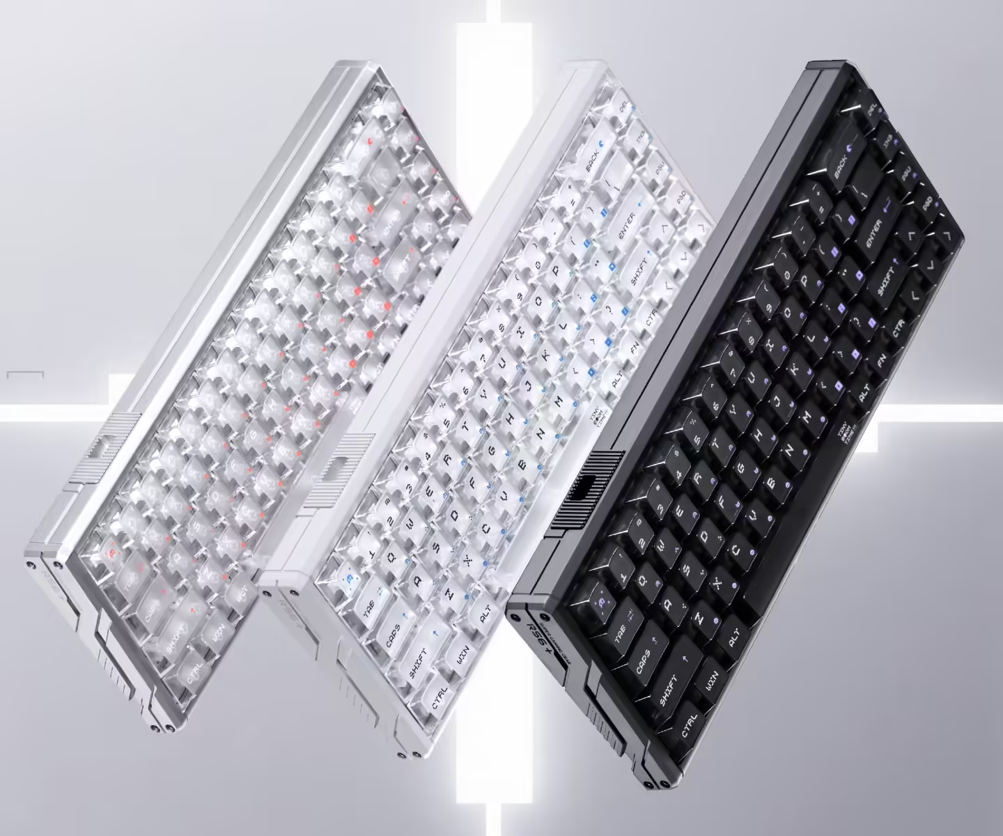 外观采用6063航空铝合金CNC一体成型机身,重约1290g的“铝坨坨”设计,既提供稳固支撑,又具备电磁屏蔽能力,侧边还加入矢量喷口等机甲元素。标配雾面PC键帽增强RGB灯光漫射效果,侧翼镜面灯带支持音乐律动光效同步;五层消音填充搭配复合材料轴下垫与硅胶/poron夹心棉,有效消除空腔音,打造HIFI级清脆纯粹的打字音。