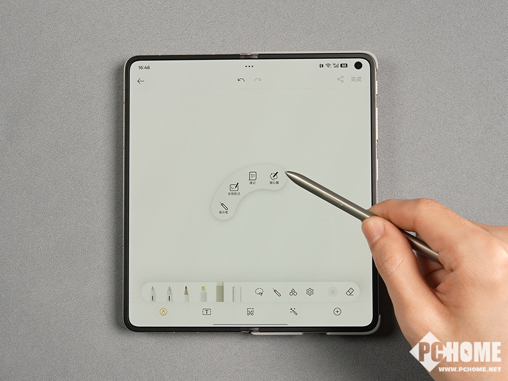 核心亮点在于手写笔与 AI 生产力的深度融合,系统提供了多种实体笔的类型,书写手感与实体笔相似,在屏幕中的滑动十分顺滑,笔尖点击与滑动感应准确。由于手写笔与手机之间会通过蓝牙连接,因此也解锁了一些遥控功能,比如投屏展示 PPT 时,可开启激光笔功能,随意圈选、标记内容,标记痕迹会在几秒后自动消失,无需手动清除。
