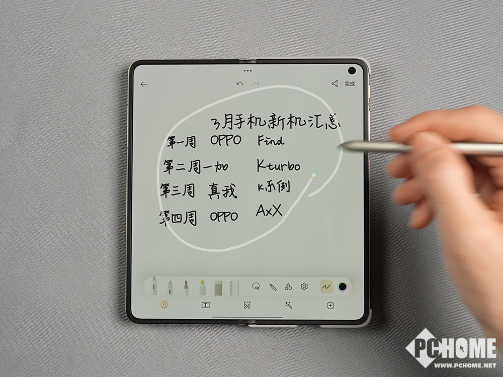 按下手写笔的物理按键后,会弹出一个轮盘,默认提供演示笔,全局批注、笔记和随心圈功能。随心圈也就是核心的AI功能了,比如针对医疗、金融、技术等需要手写记录数据的工种,配备AI绘图表功能,可快速将手写内容转换成专业图表,省去截图、扫描的繁琐步骤。这里简单演示一下,我们手写了一个新机发布时间表,圈选后就能直接生成思维导图、战略屋图以及无序列表三个不同风格的图表,效率表现惊人。
