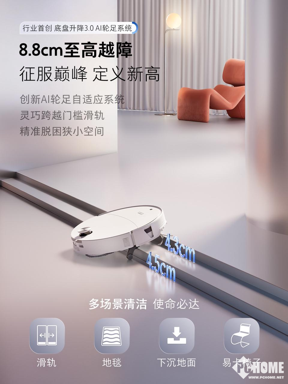 在很多家庭中,门槛和地毯是扫地机器人最常见的“物理障碍”。传统产品通常只能通过简单的驱动轮抬升来越障,这种结构在面对较高门槛或者厚地毯时往往显得力不从心。