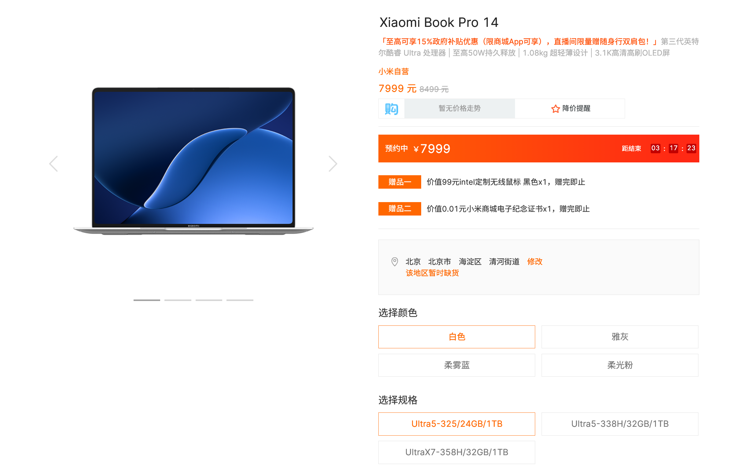 本次Xiaomi Book Pro 14推出三款配置,Ultra 5 325版24GB+1TB售8499元,Ultra 5 338H版32GB+1TB售9699元,Ultra X7 358H版32GB+1TB售10499元。首销期间限时优惠500元,优惠后7999元起,部分地区叠加15%国家补贴后6799.15元起,购机还赠送价值898元尊享服务,包含1年延保、180天只换不修、5年1次电池保等权益。
