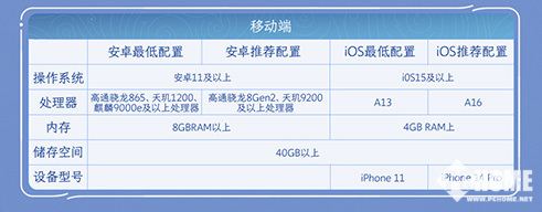 最低配置:系统版本需为Android 11及以上,处理器性能达到骁龙865、天玑1200或麒麟9000e及以上水平,运行内存≥8GB,同时建议预留40GB以上存储空间,用于安装游戏本体及后续资源更新。