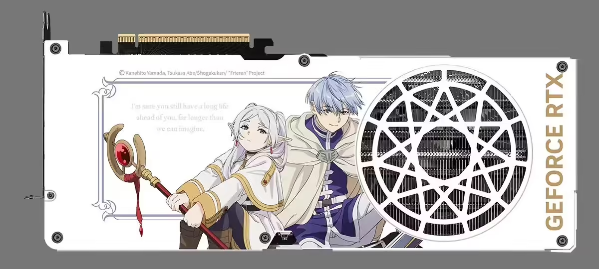 此次微星联名产品整体采用清新的配色方案,设计上深度融入《葬送的芙莉莲》的经典剧情与角色元素。核心的联名显卡基于微星经典的GAMING TRIO魔龙系列模具打造,在延续魔龙系列强悍散热模组、优秀性能调校的基础上做了专属定制,显卡背板不仅设计有魔法阵格栅通风开孔,在兼顾美观的同时提升散热效率,还采用温感变色油墨印制了角色辛美尔的标志性台词"I'm sure you still have a long life ahead of you, far longer than we can imagine.",成为联名设计的点睛之笔。