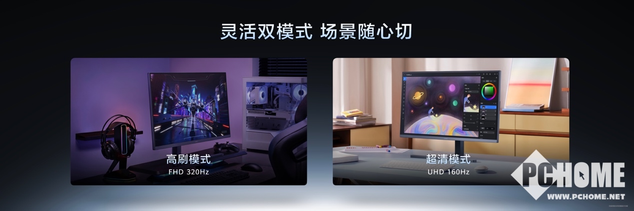 在分辨率与刷新率上,产品分为流畅版与超清版两个版本,流畅版拥有2.5K分辨率支持200Hz高刷,超清版则配备4K超分辨率,支持UHD 160Hz与FHD 320Hz双模切换,既能满足4K影音的高清需求,也能为竞技游戏提供极致帧率,兼顾办公生产力与娱乐性。