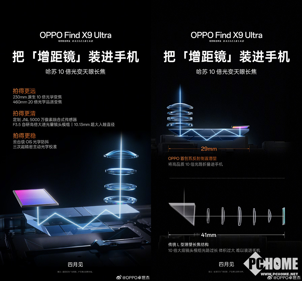 PChome 3月24日消息,OPPO刘作虎发文称,OPPO Find X9 Ultra配备了哈苏10倍光变天眼长焦,这是一颗具备10X光学变焦的长焦镜头,是手机完整影像能力的最后一块拼图。