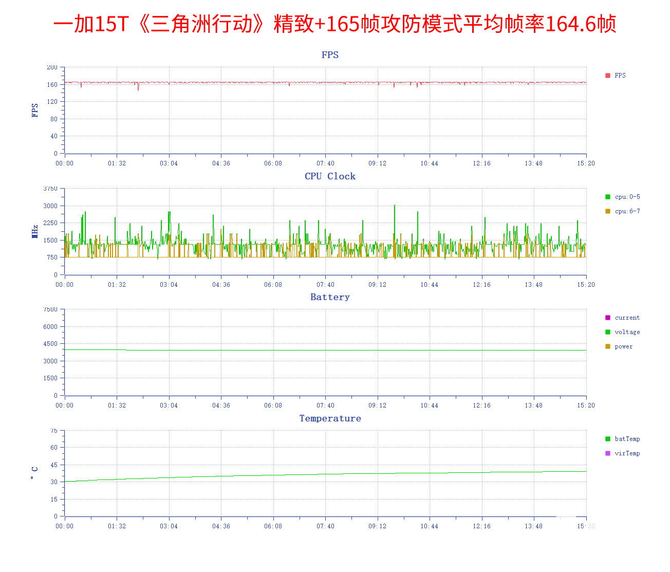 接下来看看游戏实战表现,首先进行《三角洲行动》攻防模式测试。一加15T在该游戏中提供原生165帧渲染模式,开启后画质会自动调整为精致模式,与一加15的画质适配标准一致,这也是游戏官方对一加15T性能的高度认可。一局游戏结束后,一加15T跑出164.6帧的流畅表现,帧率曲线稳定无明显波动,除重新部署阶段有轻微帧率调整外,其余时间均能满帧运行,流畅度无可挑剔。
