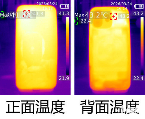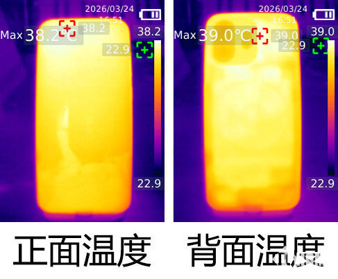 发热控制同样令人满意,在22℃室温环境下,机身最高温度不超过39℃,手持无明显发热感。尤其是左手摇杆轮盘区域,无任何发热影响操控,搭配165Hz高帧率画质,操控、压枪均顺滑流畅,游戏体验拉满。