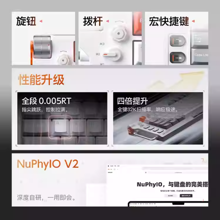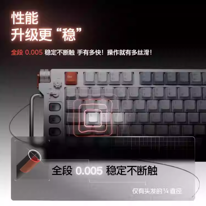 这款键盘搭载0.005mm精度的Rapid Trigger快速触发功能,可自定义0.001-3.3mm触发键程,搭配32kHz全键扫描率与8kHz回报率,实现全键无冲、低延迟输入,能精准适配FPS游戏的急停、连跳等精细操作,大幅降低断触风险。