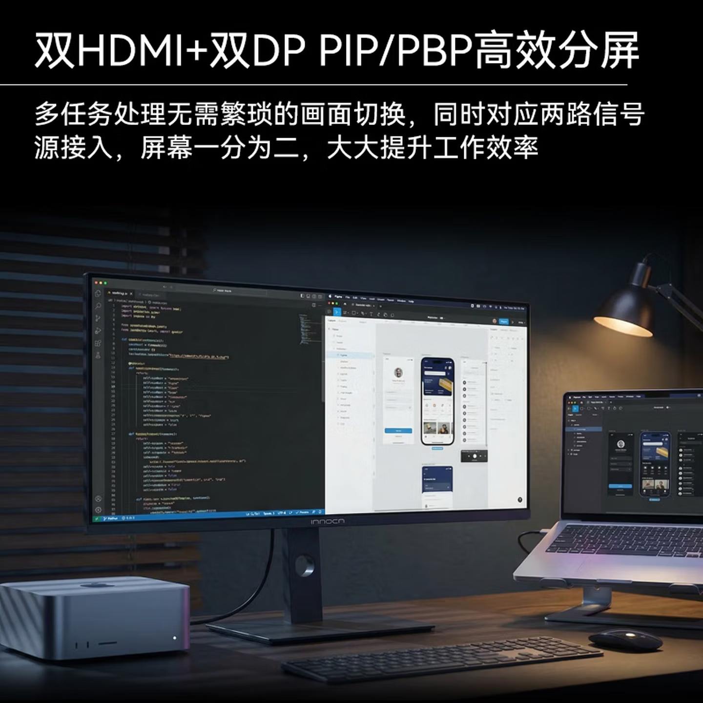 同时标配人体工学支架,支持0-120mm升降、-5°~15°俯仰及30°左右旋转,预留100×100mm VESA壁挂孔,适配不同使用场景。接口丰富,双HDMI 2.0+双DP 1.4接口支持PIP/PBP分屏功能,可同时连接两台主机,内置双3W扬声器与3.5mm音频接口,满足日常视听需求。