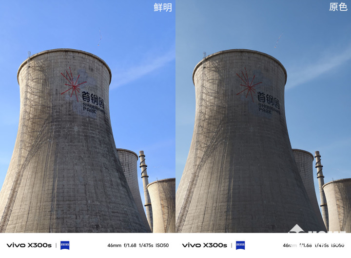 在相机拍摄模式中,该机新增了原色模式,切换至该模式拍照,画面舍弃了浓艳的滤镜感,反而更贴近真实场景。以烟囱样张对比为例,鲜明模式饱和度偏高,背阴区域被强行提亮,天空也被过度调蓝,和人眼实际看到的场景相差甚远。而原色模式下,光线过渡更柔和,色彩表达更克制,主打真实氛围感的还原,和肉眼所见的画面高度契合。