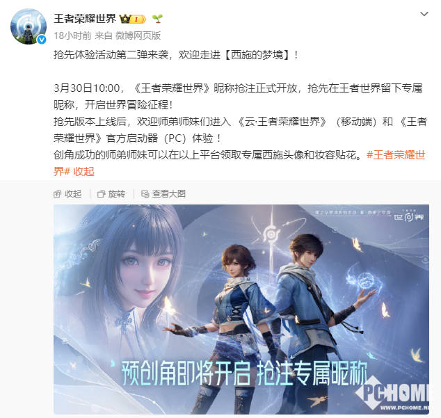 PChome 3月30日消息,腾讯《王者荣耀世界》官方宣布,将在3月30日10:00正式开放昵称抢注。在抢先版本上线后,玩家即可在《王者荣耀世界》官方启动器(PC)体验游戏,移动端玩家则可通过《云 · 王者荣耀世界》进行体验。
