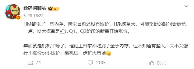 小米和华为目前还没有涨价的原因,是这两家在涨价前都囤了货。华为的采购量很大,可能坚挺的时间会更长一点。小米大概率是能扛过Q1季度的,Q2阶段的新品就会开始涨价了。