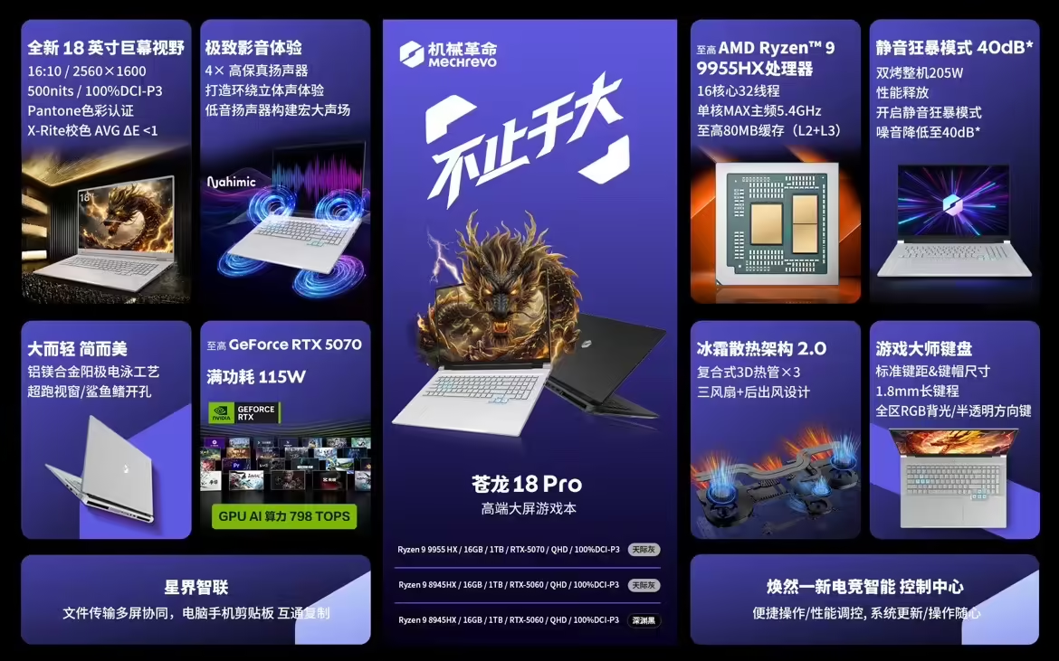 PChome3月30日消息,机械革命苍龙 18 Pro现已正式发售,定位18英寸大屏高性能游戏本,主打轻量化机身与旗舰级配置的平衡,成为当前主流价位段少有的18英寸轻薄性能本。