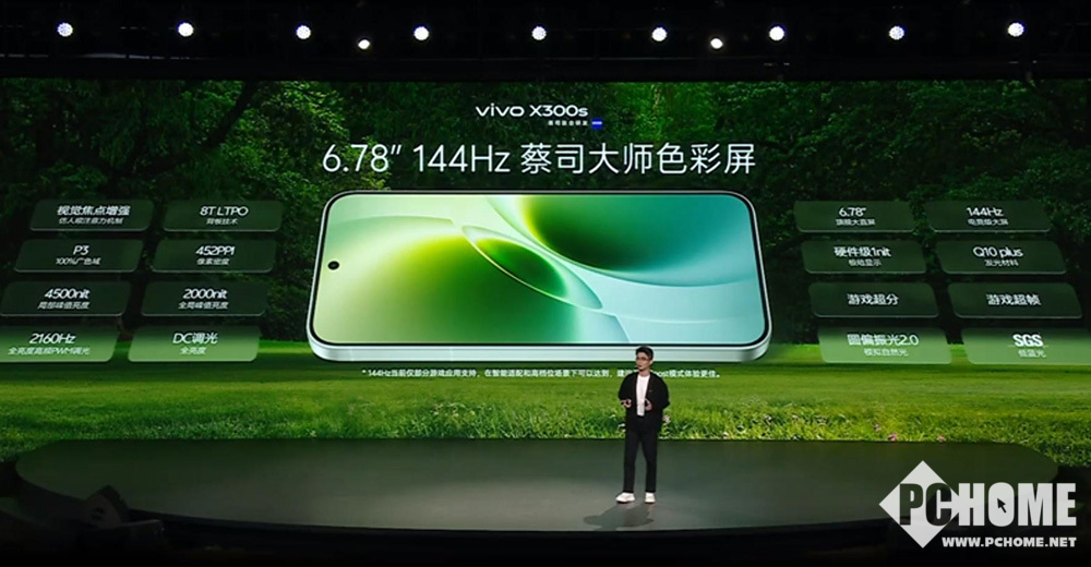vivo X300s采用经典小直屏设计,机身覆盖悬浮水滴冷雕玻璃,拥有撞色美感。提供胶片绿、梦核紫、银白、钛黑四种配色。搭载6.78英寸旗舰直屏,支持144Hz高刷新率游戏体验,适配《王者荣耀》原生144Hz画质。峰值亮度高达4500nit,并提供1nit的硬件低亮度显示。提供全亮度DC调光+最高2160Hz高频调光,护眼方面支持圆偏振光2.0,并提供8T LTPO,各种环境使用都不伤眼。