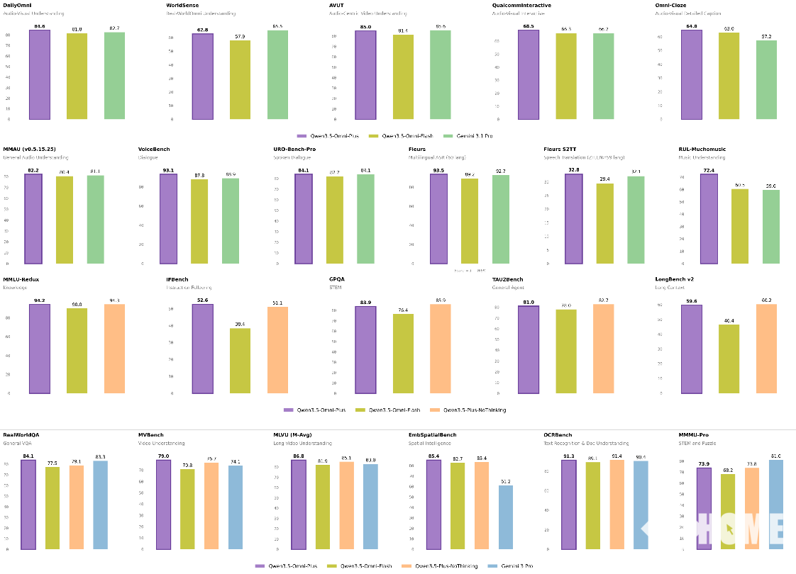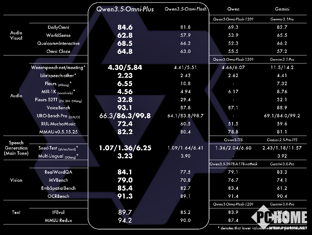 Qwen3.5-Omni采用混合注意力MoE架构,在海量文本、视觉以及超过1亿小时的音视频数据上进行了原生多模态预训练,可实现图片、视频、语音、文字等全模态内容的输入与输出。新模型在音视频理解、跨模态推理、Agent方面实现了性能飞跃,在音视频理解、语音识别、多语种翻译、对话等215项第三方性能测试任务中取得SOTA。比如,在聚焦视听交互能力的DailyOmni、QualcommInteractive、Omni Cloze等测试中,Qwen3.5-Omni得分大幅领先Gemini-3.1 Pro;在检测嘈杂环境抗干扰能力的WenetSpeech测试中,Qwen3.5-Omni错误率远低于Gemini,识别准确率极高;在考察多语言语音生成质量的Multi-Lingual (30lang) 测试中,Qwen3.5-Omni同样显著优于Gemini-2.5-Pro-TTS。