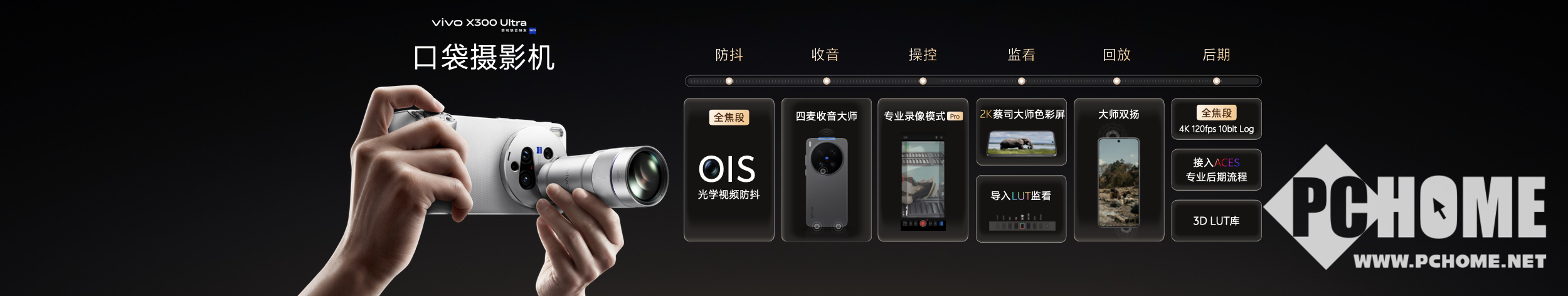 创作自由不只属于静态影像,为此vivo X300 Ultra视频能力再度升级。不仅全焦段视频高规格,而且全焦段视频好画质。防抖方面,全焦段OIS光学视频防抖,其长焦3°OIS光学防抖能力,即使装上增距镜拍摄,依然稳定出片。收音方面,四麦收音大师,支持6大场景化收音预设,一键获得高质量的收音,还可以连接专业的无线麦,实现收音自由。在监看上,2K蔡司大师色彩屏作为取景器,全场景取景和监看时色彩更真实;参考专业电影摄影机全新推出的专业录像模式Pro,参数布局清晰,调节更便利,一键清屏功能只需轻点屏幕,便可沉浸式构图;开放的自定义3D Lut导入监看功能,让用户可以将常用的调色LUT直接加载进取景器,拍摄时就能预览最终的电影色调。在回放上,全新升级的大师双扬,上扬净腔体积提升至270%,堪比电影级声场。最后也是最重要的一步,在后期方面,全焦段4K 120fps 10bit Log,422采样,APV帧内编码,完整将色彩和影调的决定权交给后期;同时vivo Log已适配ACES专业后期流程,让Log素材能与专业电影摄影机素材在同个色彩空间协同调色,无缝对接影视制作体系。此外,还可直接在相册中预览、烧录3D Lut,vivo摄影App还内置3D Lut库,定期更新风格化预设,让用户轻松获得独特的调色风格。V单真正打通了从拍摄到后期、完整可控的专业视频创作工作流,当用户在观看演唱会或体育赛事时,抬手就能拍出转播级画面。