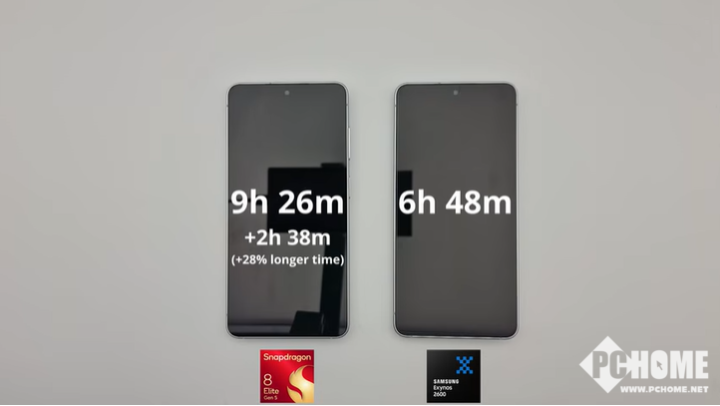 三星S26系列使用了差异化芯片策略,根据测试数据显示,骁龙版的续航表现明显胜过猎户座版本,续航时长的差距高达39%。