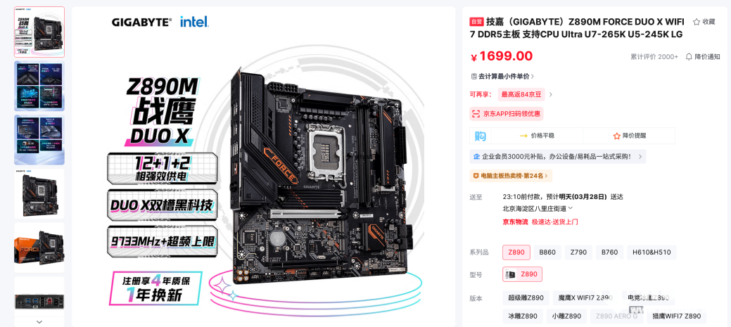 目前技嘉Z890M战鹰DUO X主板正在京东商城热销中,新品上市限时售价仅为1699元,现在购买注册还可享受4年质保,1年换新服务,下单还可返京豆,近期有装机需求的用户千万不要错过!直达链接:https://item.jd.com/100332985714.html