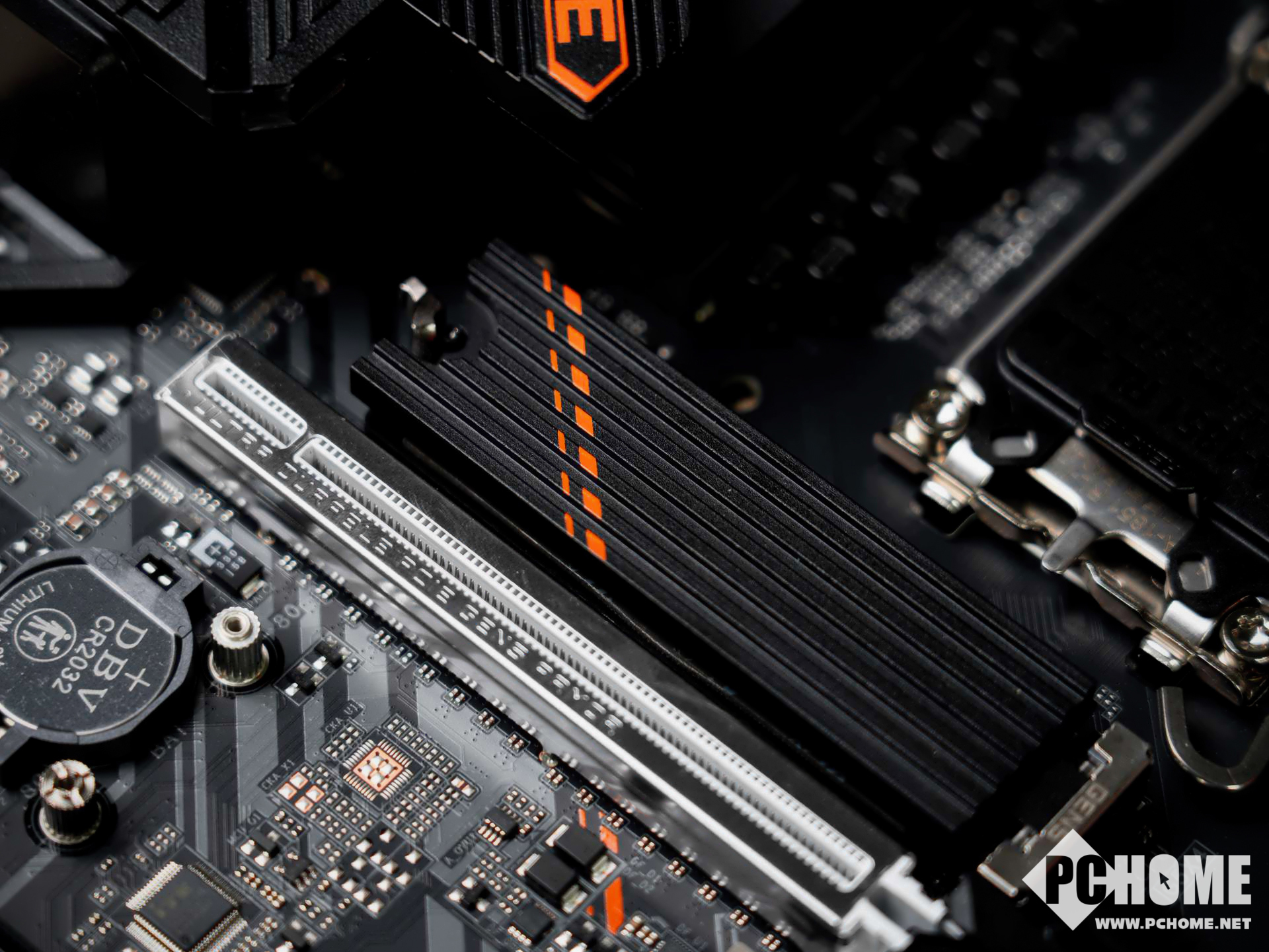 技嘉Z890M战鹰DUO X主板提供5组M.2 SSD插槽,其中1组是CPU直连的PCI-E 5.0x4通道,覆盖厚实的铝制散热装甲,对于PCIe 5.0固态硬盘发热的问题不用担心。其它4组均为PCI-E 4.0规格,内存右边位置同样覆盖了散热装甲,一个小细节是M.2背板还设计了弹性设计,安装时可以紧密贴合硬盘背部,更稳定。