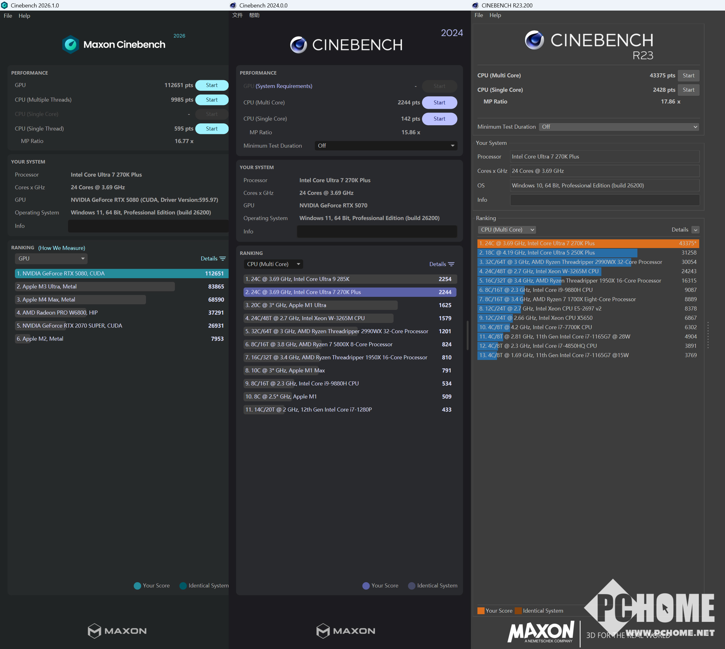 在CINEBENCH系列基准测试的CPU测试中,酷睿Ultra 7 270K Plus在CINEBENCH 2024/2026版本中,多核成绩分别高达2244 pts和112651pts ,常用的R23版本中CPU单核成绩为2428 pts,多核成绩高达43375 pts,均处于目前消费者处理器的领先水准,在技嘉Z890M战鹰DUO X主板上发挥出色。