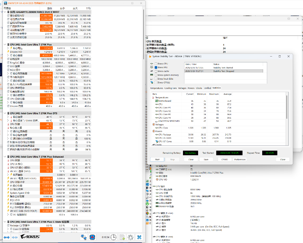功耗方面,在AIDA64的CPU满载15分钟测试中,在技嘉Z890M战鹰DUO X主板的稳定供电和360水冷散热器的帮助下,酷睿Ultra 7 270K Plus处理器的最高输出功耗达到276瓦,平均输出功耗235瓦,接近TDP上限,CPU核心平均温度82°C,性能输出非常稳定。