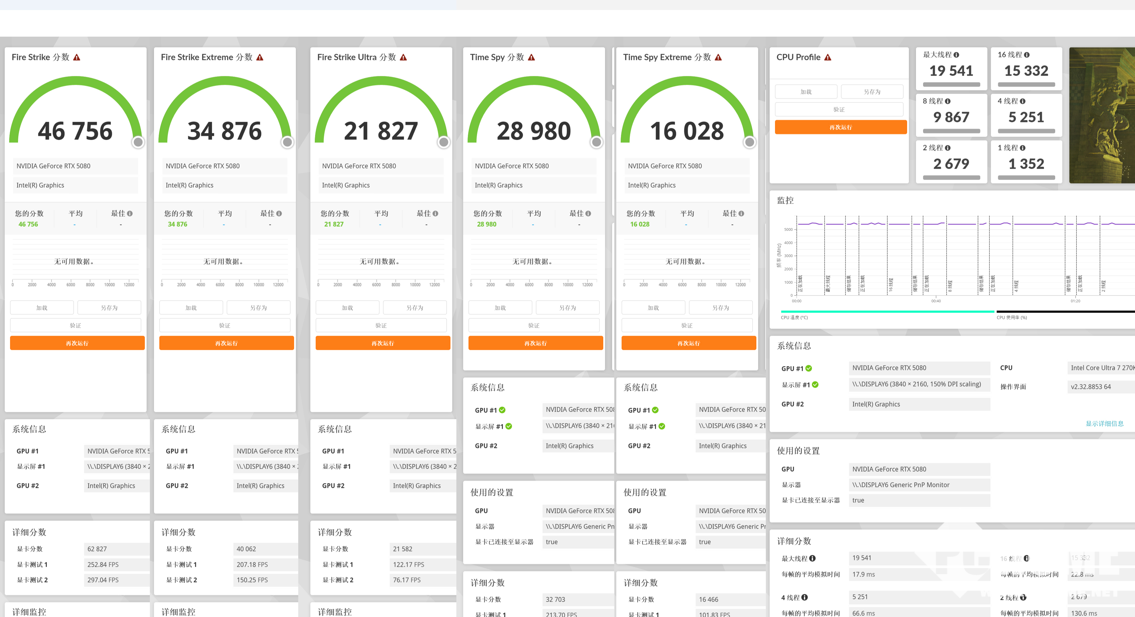 在3DMARK的基准图形性能测试中,技嘉RTX 5080超级雕TimeSpy的成绩高达32703分(显卡分数,下同),TimeSpy Extreme达到16466分。24线程的CPU Profile测试中,得分到19541,这个成绩同样已经超过了Ultra 9 285K。