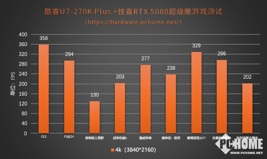 至于广大游戏玩家们关注的游戏性能,其实对于RTX 5080显卡来说是十分轻松的,在Ultra 7 270K Plus的配合下,以及NVIDIA DLSS 4多帧生成技术在《CS2》《F124》《怪物猎人荒野》《黑神话:悟空》《古墓丽影:暗影》《F1@24》《赛博朋克2077》《战争机器5》《地平线零之曙光》等9款具有代表性的游戏中,均能获得超流畅的体验。