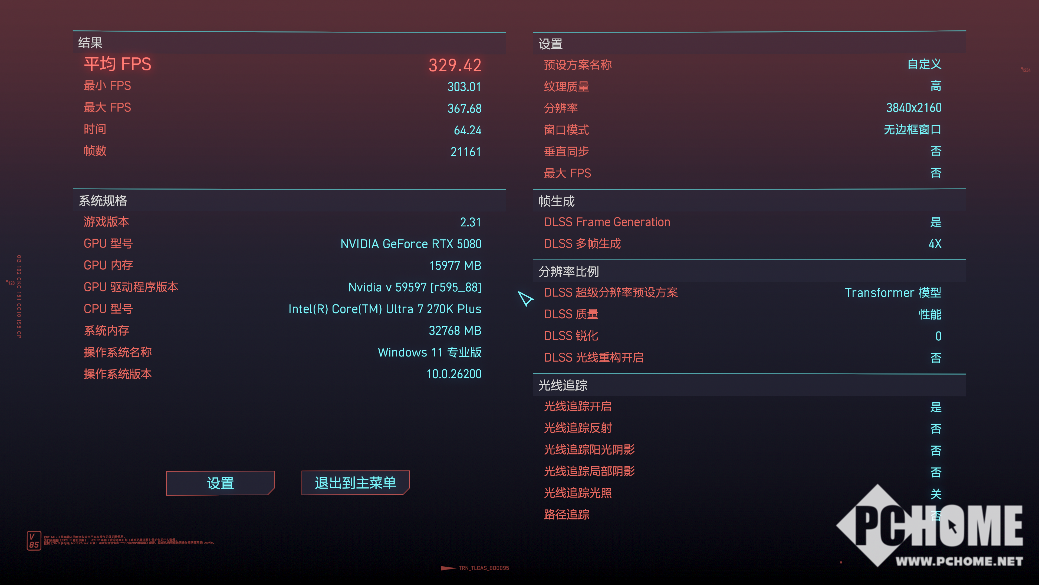 在4K分辨率、高画质、开启光线追踪、DLSS性能档的设定下(如游戏支持则开启4x帧生成),平均FPS在130FPS以上,尽可放心畅玩。