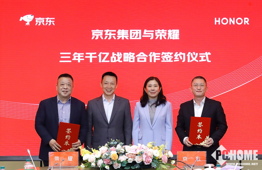 PChome 4月2日消息,荣耀与京东签订战略合作协议,正式建立全方位战略合作伙伴关系,双方将围绕产品共创、用户共营、生态共享三大核心领域,构建全面覆盖、深度融合、价值共生的新型合作体系,致力于实现三年累计规模超1000亿元的全领域合作目标。