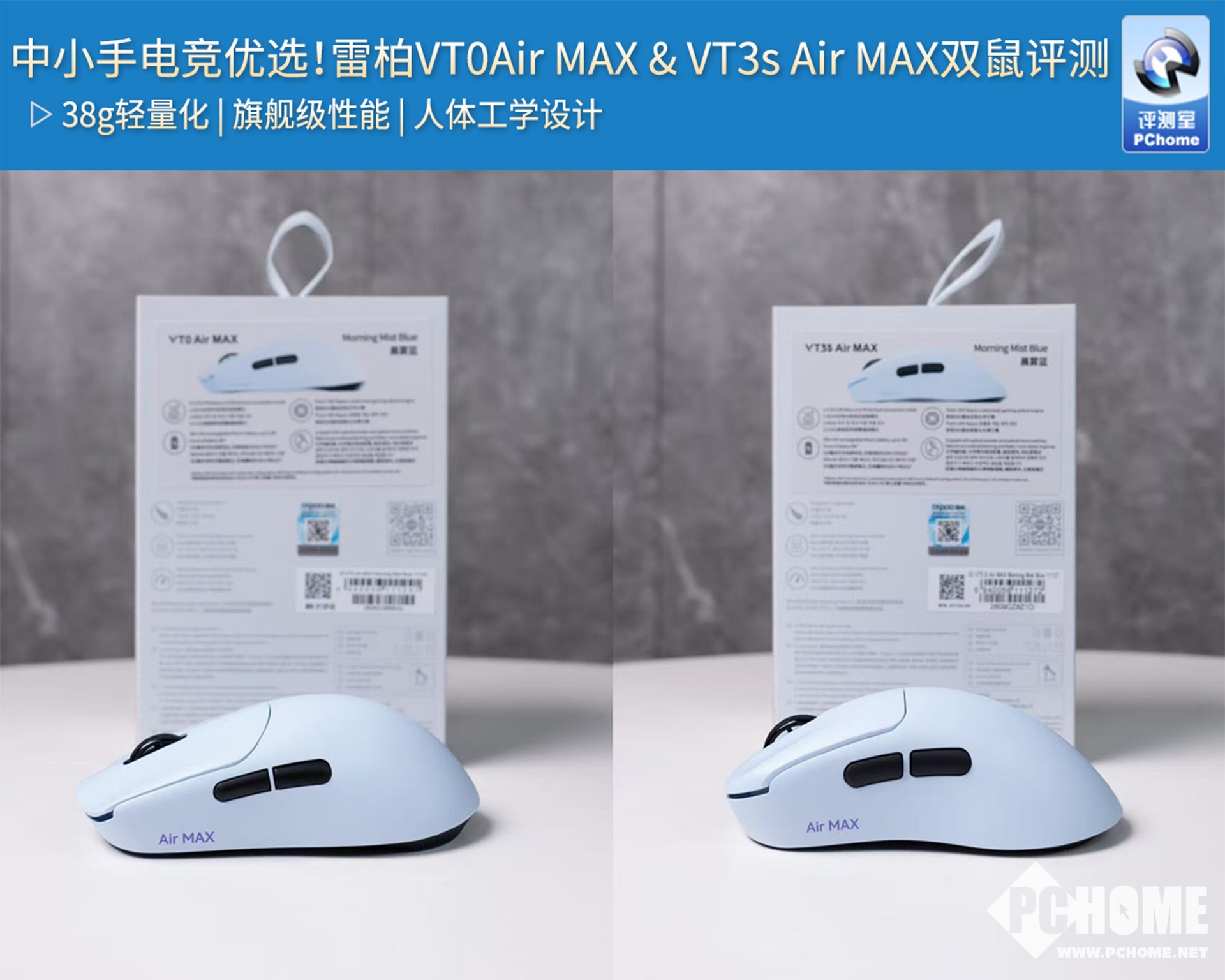 今天PChome评测室迎来雷柏全新Air MAX第二代系列的两款电竞鼠标——VT0Air MAX与VT3s Air MAX,本次评测将从模具手感、核心硬件、竞技性能等维度解析,看看其是否能成为中小手玩家的“轻量化电竞利器”。