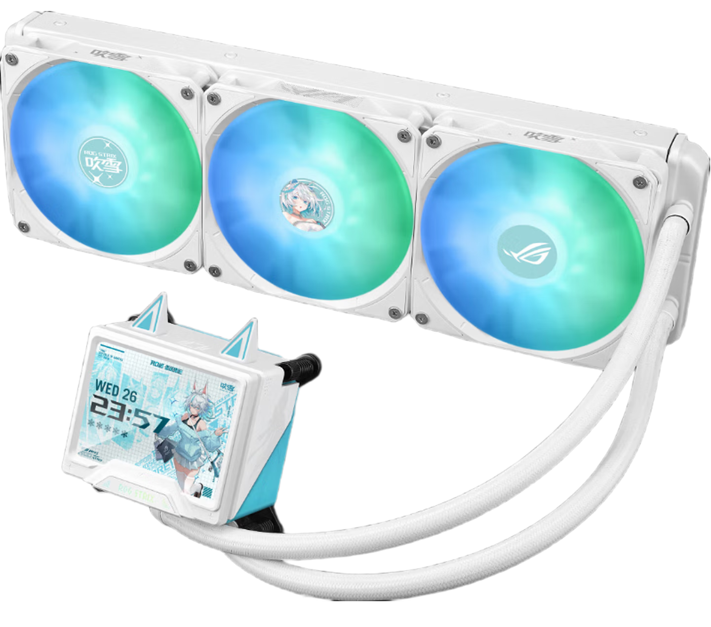外观与交互方面,配备3.5英寸LCD方形冷头屏幕,可自定义显示硬件参数、动图及短视频,可玩性突出;延续吹雪系列白蓝撞色设计,附带吹雪姬定制铭牌、摆件等小配件,二次元属性拉满,且支持AURA SYNC神光同步,可与华硕全系列硬件实现灯效联动。