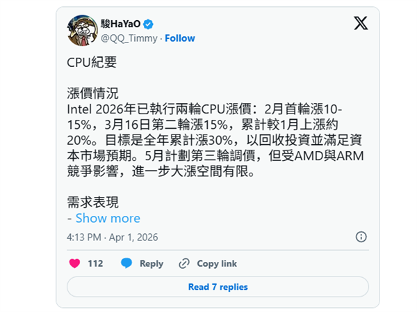 2026年开年仅过去三个月,Intel便在消费级CPU市场接连落地两轮涨价,按照企业规划,全年还将完成第三轮调价,累计涨幅最高将冲击30%,这一激进的定价策略也成为近期装机市场的一大变数。