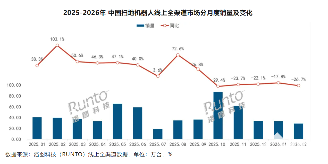 2026年1月-2月,中国扫地机器人线上全渠道市场累计销量为62.1万套,同比下降22.2%;销额为20.1亿元,同比下降13.7%。