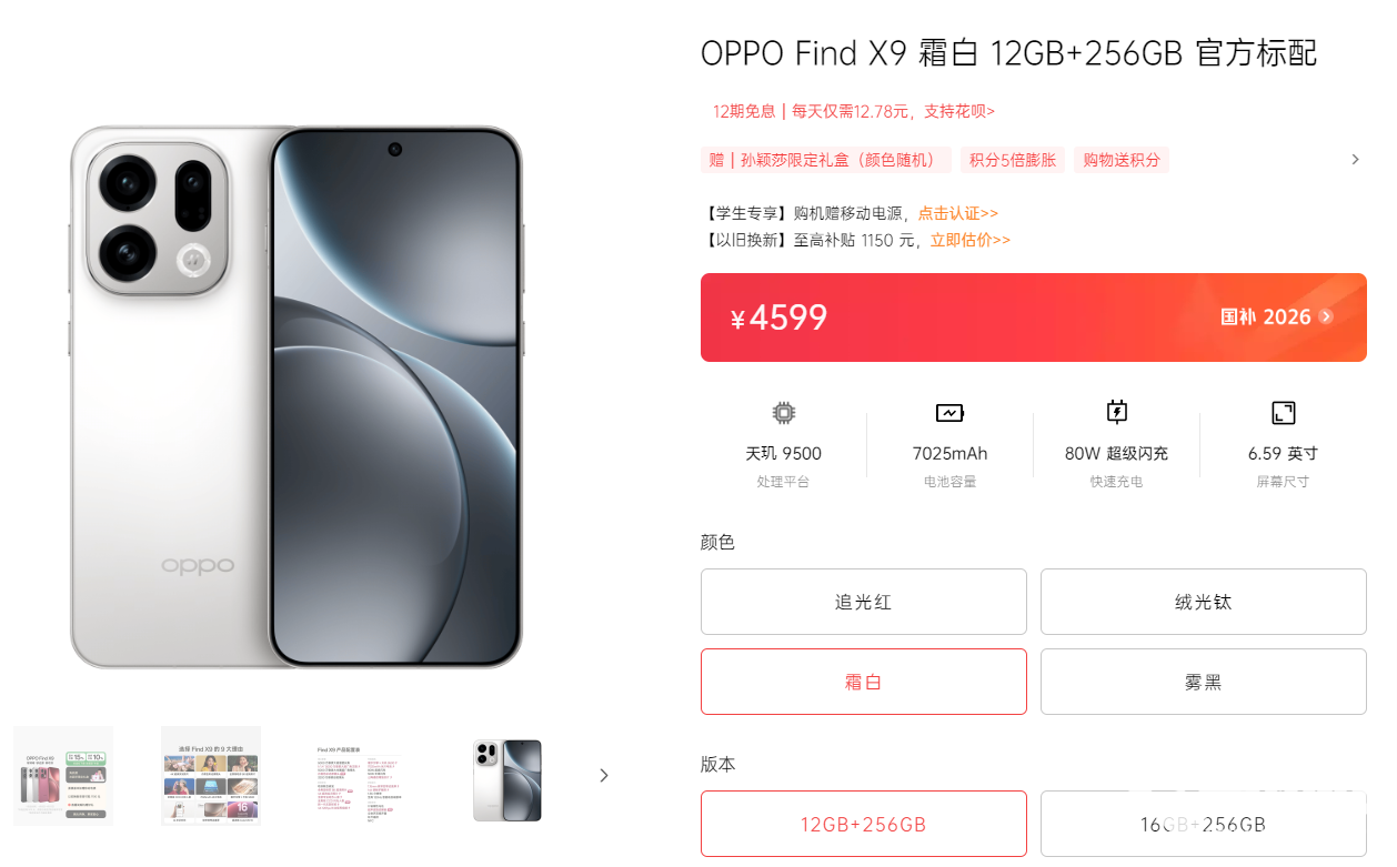 目前在OPPO官方商城中,OPPO Find X9已经进行了价格调整,12GB+256GB由4399元调整为4599元,16GB+256GB由4699元调整为4999元,12GB+512GB由4999元调整为5299元,16GB+512GB由5299元调整为5999元,16GB+1TB由5799元调整为6299元。总结来说,就是入门版涨价200元,1TB版涨价500元,其他版本涨价300元,想要入手大存储版本的成本更高了。