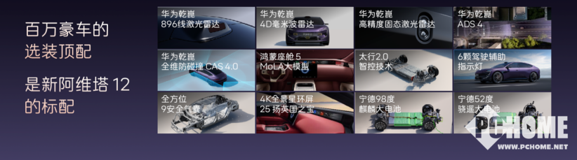 强大的产品力背后,是长安、华为、宁德时代三方顶尖资源的联合赋能。PChome获悉,华为为双车提供了全栈智能科技支持。在智驾层面,两车均搭载了华为全球量产最高896线双光路图像级激光雷达、乾崑ADS 4.1辅助驾驶系统与CAS 4.0全维防碰撞系统;智舱层面则均搭载鸿蒙座舱HarmonySpace 5,内置MoLA大模型多维智能体。驾控方面,双车均搭载最新太行智控2.0技术及太行分布式电驱,其中后者集多项全球首创技术与行业第一参数于一身,新阿维塔12三电机四驱版零百加速仅需2.71秒。在电池安全与续航方面,宁德时代为双车提供了定制化电池方案,新阿维塔12纯电版续航达735km,快充补能迅速;阿维塔06T纯电版续航亦达741km,有效缓解续航焦虑。