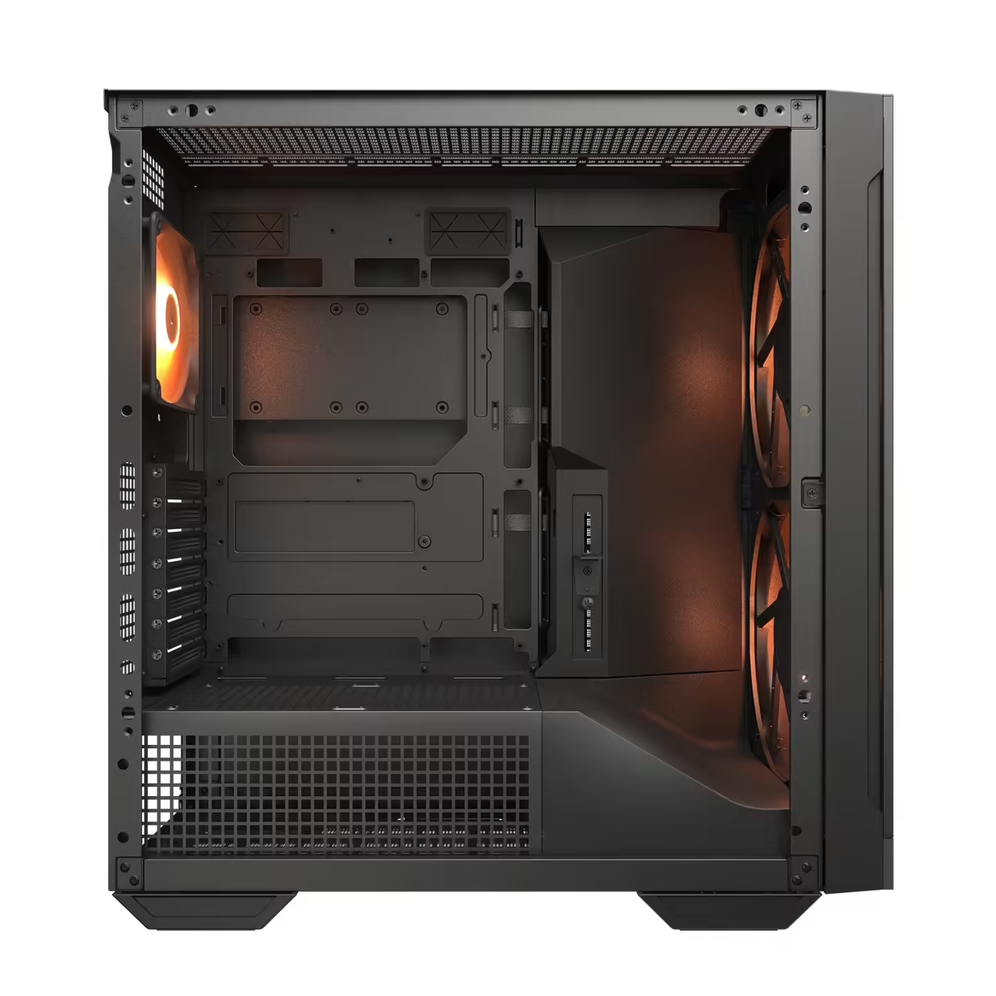 散热方面,机箱底部采用双曲线进气坡道,优化气流路径并降低风阻,前置预装两颗200mm ARGB PWM风扇,可定向增强显卡区域散热;顶部支架可拆卸,兼容360/280冷排,后板预装120mm ARGB风扇,电源舱还可加装双120mm风扇,形成立体散热系统,保障硬件稳定运行。