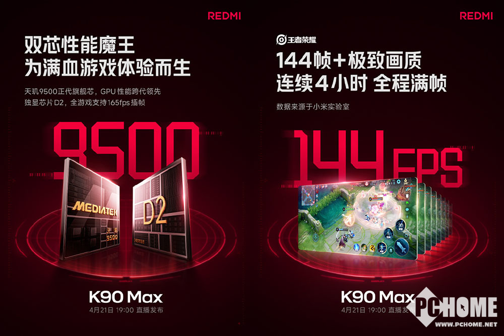 PChome 4月14日消息,REDMI K90 Max将在4月21日晚间发布,这款手机有着旗舰双芯规格,配备了165Hz高刷电竞屏,支持40多款游戏的165fps模式原生适配。而在原生适配游戏之外,其他所有游戏均能通过插帧的方式实现165fps高帧率。