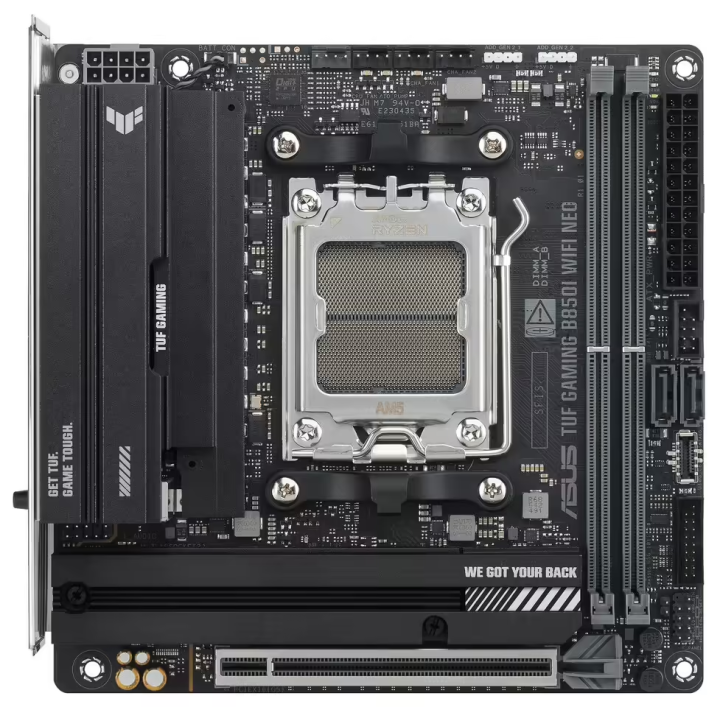 主板采用AMD B850芯片组,支持AM5插座,兼容锐龙7000/8000/9000系列处理器,为游戏与AI应用筑牢性能基础。供电与设计上,配备10层PCB+2oz低损耗铜基板,采用军工级组件提升稳定性;8+2+1相80A强化供电,支持AI性能优化,深色PCB搭配黑色散热装甲,延续TUF系列硬派风格。