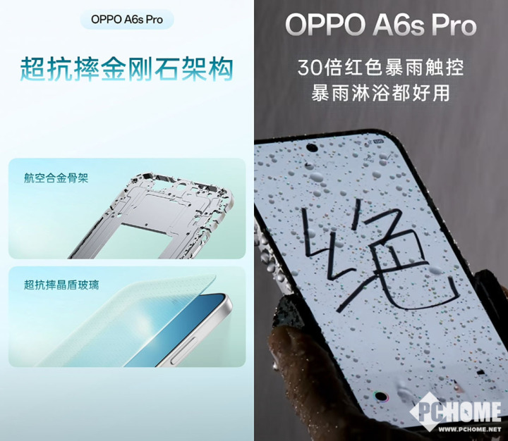 PChome了解到,OPPO A6s Pro提供了IP66+IP68+IP69满级防水,不仅能够防止各种液体的侵害,而且可以在涉水环境中正常使用,哪怕在30倍红色暴雨冲刷下,也能正常准确流畅操控,这是由于OPPO采用了独家算法支持,能够分辨出触控特征,将雨水冲刷识别为无效操作,只会响应手指操控。在手机防摔方面,表面覆盖旗舰同款晶盾玻璃,中框采用航空合金骨架,内部还填充了大量缓冲材料,对各种意外情况都能防护。
