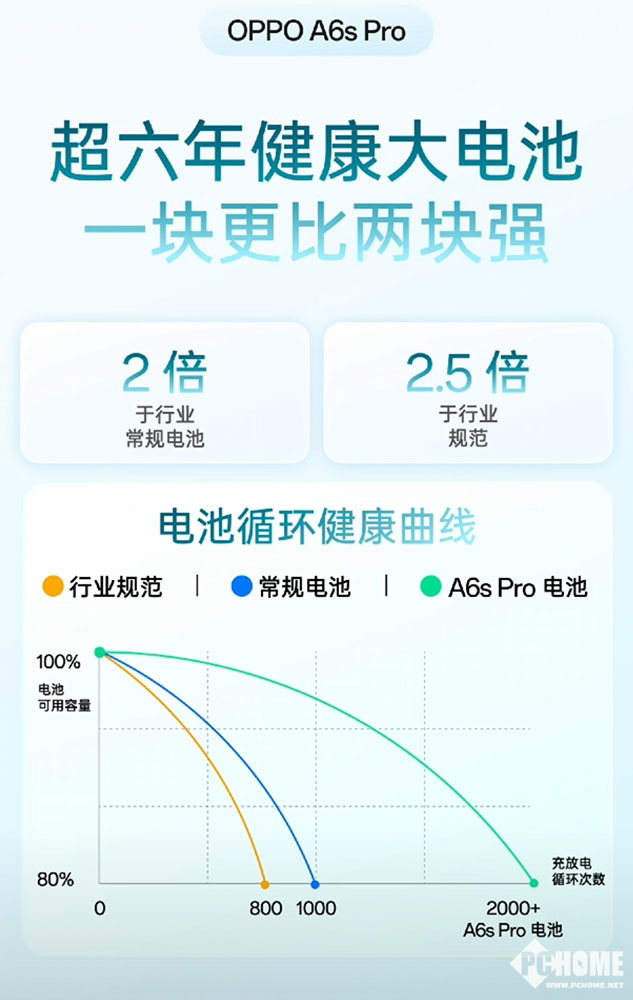 续航方面,OPPO A6s Pro提供了7000mAh六年长寿大电池,这块电池还具有长寿特点,通过电解液自修复技术,将电池健康循环提高到了2000次,相比行业标准的800次循环,电池寿命提升了2.5倍。快充支持80W超级闪充,不到1小时即可充满,满足普通用户两天续航需求。