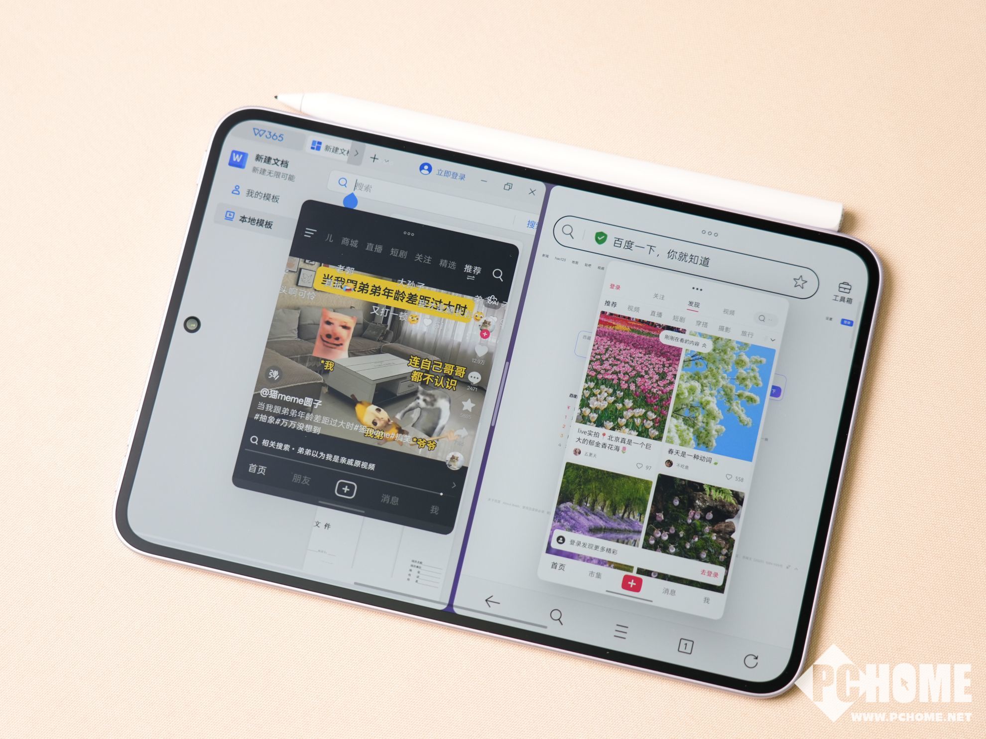 除了全屏状态,OPPO Pad Mini在分屏、小窗悬浮时,也能更高效利用这块屏幕,匹配不同使用场景。搭配分屏快捷手势,整体操作流畅高效。实测在开启两个分屏时,还能同时显示两个悬浮小窗,我们可以在左边开启WPS编辑文档,同时右边开启浏览器查阅资料。同时在悬浮窗打开抖音和小红书偶尔“摸摸鱼”放松一下。在开启三个分屏时,可以显示一个悬浮小窗,悬浮小窗还能随时便捷替换。而且得益于144Hz刷新率,无论是滑动屏幕、切换分屏和悬浮窗,都更加丝滑顺畅。