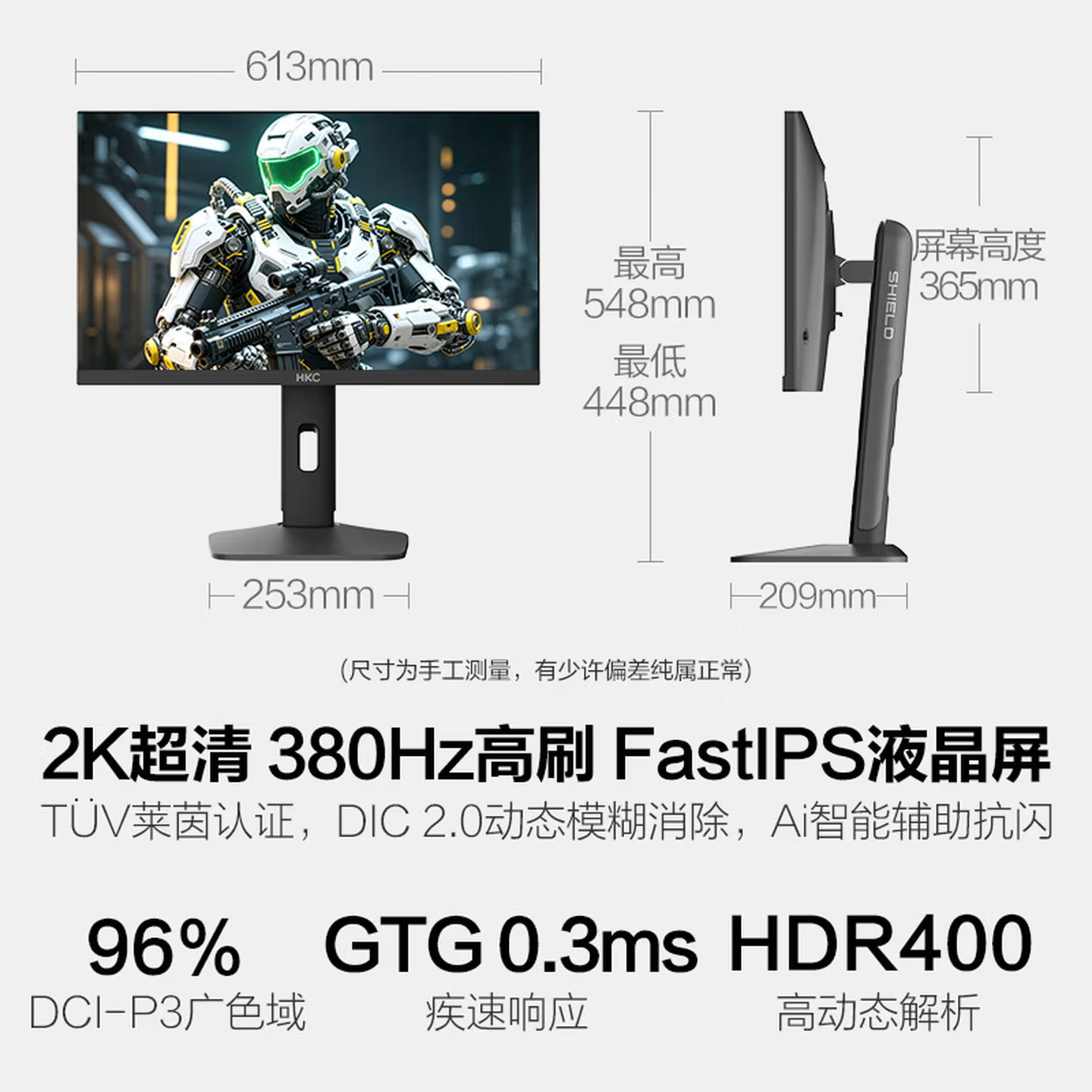 显示性能方面,该显示器采用24.5英寸Fast IPS面板,原生2K分辨率(2560×1440),原生360Hz刷新率可超频至380Hz,搭配0.3ms GTG响应时间及HKC自研DIC 2.0动态模糊消除技术,有效减少拖影。色彩上覆盖100% sRGB和96% DCI-P3色域,10bit色深,峰值亮度400尼特,通过HDR400认证,同时配备硬件级低蓝光与DC调光,呵护用眼健康。