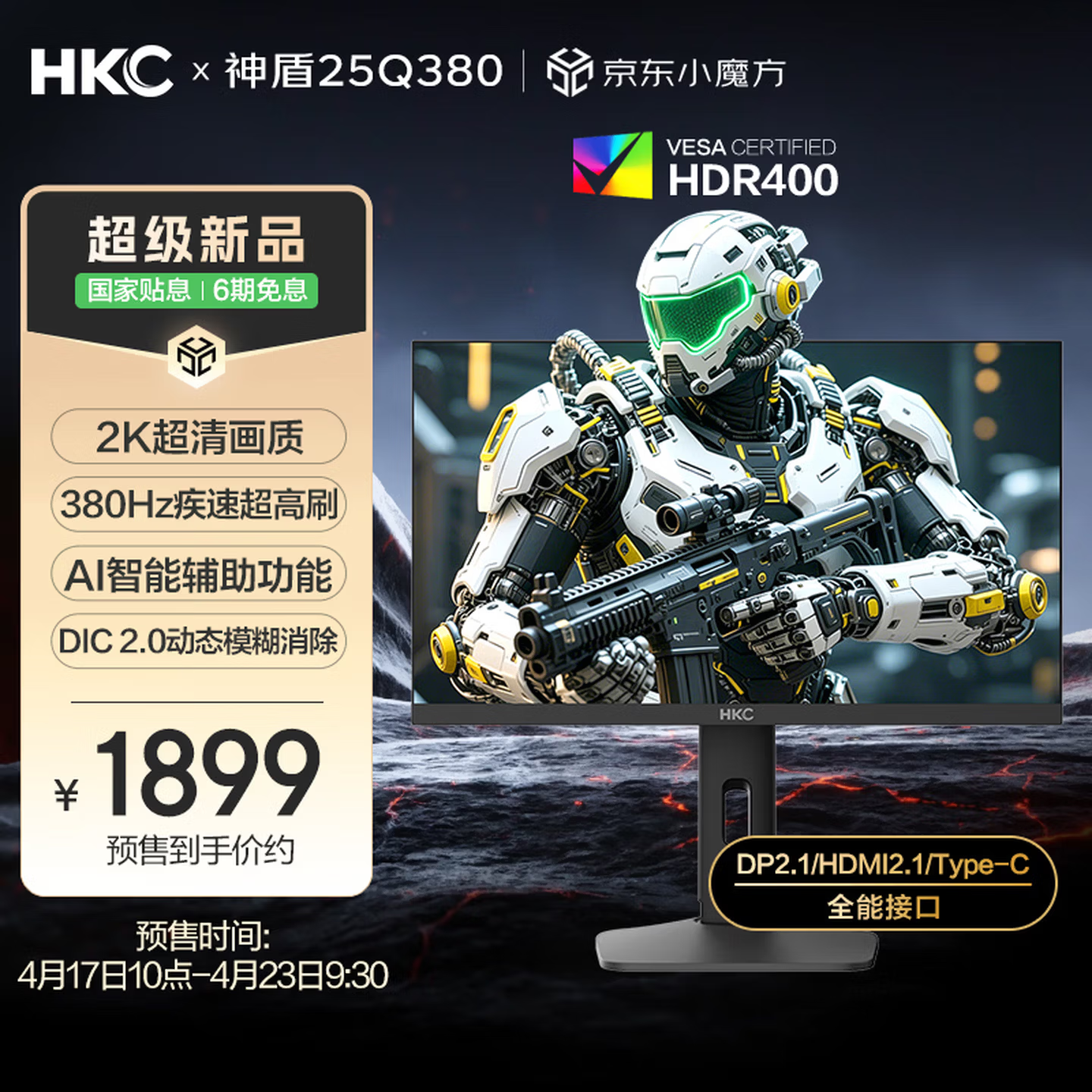 PChome4月16日消息,HKC正式上架新款24.5英寸专业级FPS电竞显示器“神盾25Q380”,主打2K分辨率与380Hz超频刷新率,首发价1899元,定位FPS职业玩家及追求极致流畅体验的电竞爱好者。